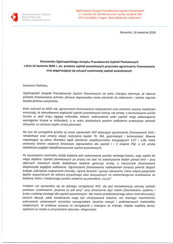 Popieramy postulaty przedstawione przez Ogólnopolski Związek Pracodawców Szpitali Powiatowych, zawarte w stanowisku z dnia 16 kwietnia 2026 r.