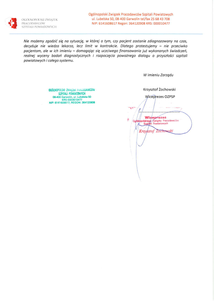„Nie możemy zgodzić się na sytuację, w której o tym, czy pacjent zostanie zdiagnozowany na czas, decyduje nie wiedza lekarza, lecz limit w kontrakcie. Dlatego protestujemy – nie przeciwko pacjentom, ale w ich imieniu – domagając się uczciwego finansowania już wykonanych świadczeń, realnej wyceny badań diagnostycznych i rozpoczęcia poważnego dialogu o przyszłości szpitali powiatowych i całego systemu”